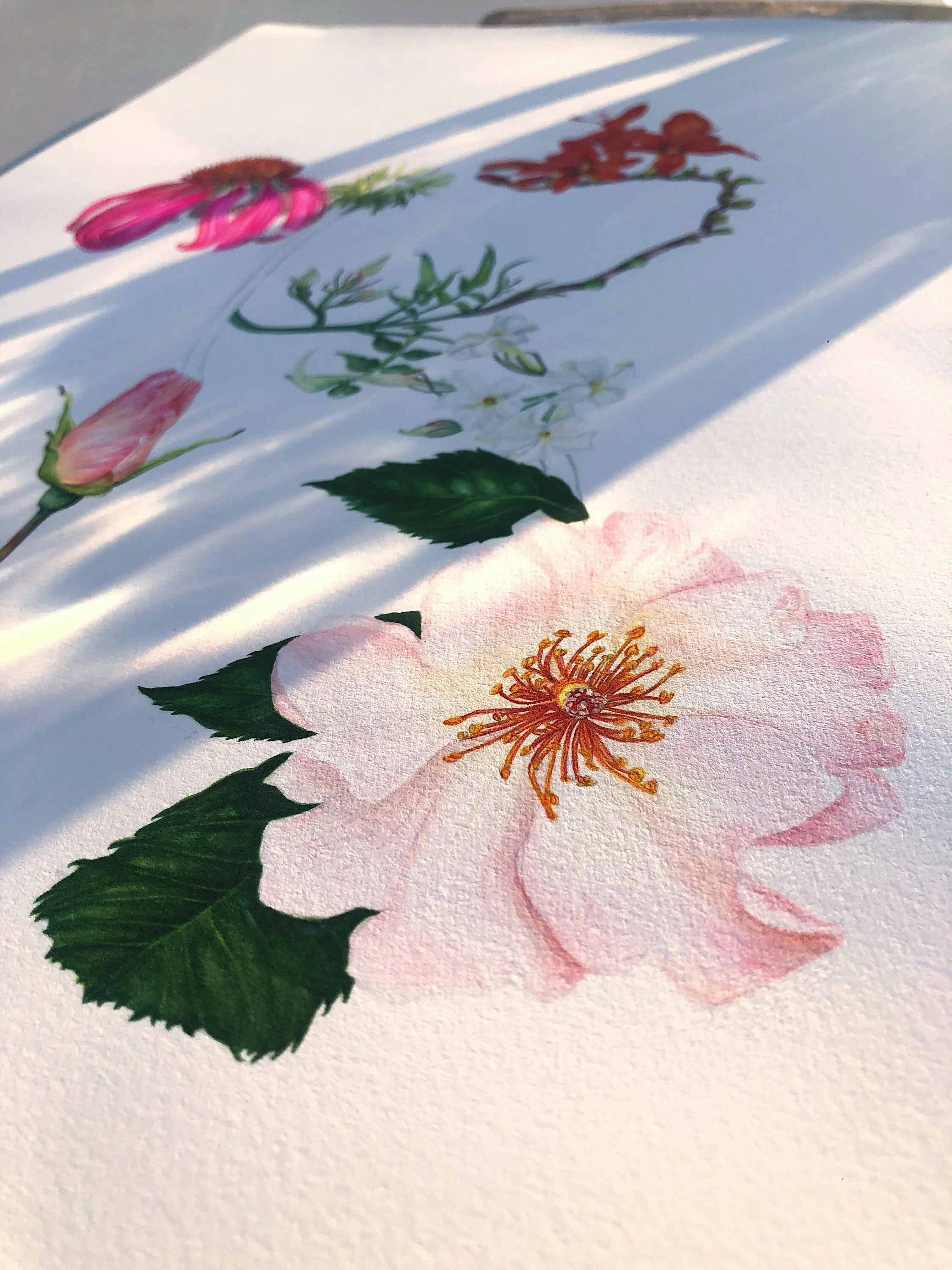 A botanical project that started with the birth of my daughter. I wanted to create a ‘keepsake’ to celebrate her arrival and to visualise her name through the flowers blooming in the garden. Each flower represents the initials of her first, middle and last names; Rose, Jasmine, Echinacea and Crocosmia.